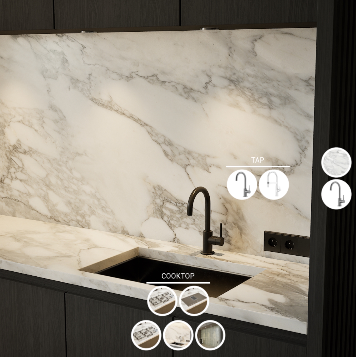 Welcome to our Kitchen Configurator! This tool allows you to customize various elements of a kitchen in real time, providing a seamless and interactive experience. Explore different design options and see instant changes to the lights, faucets, colors, and cameras.